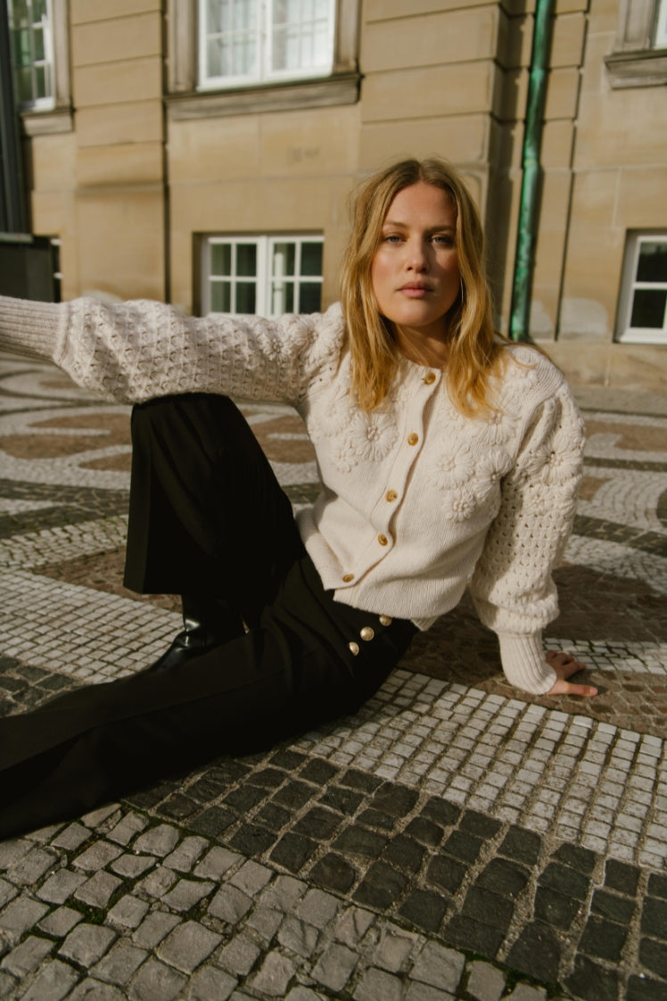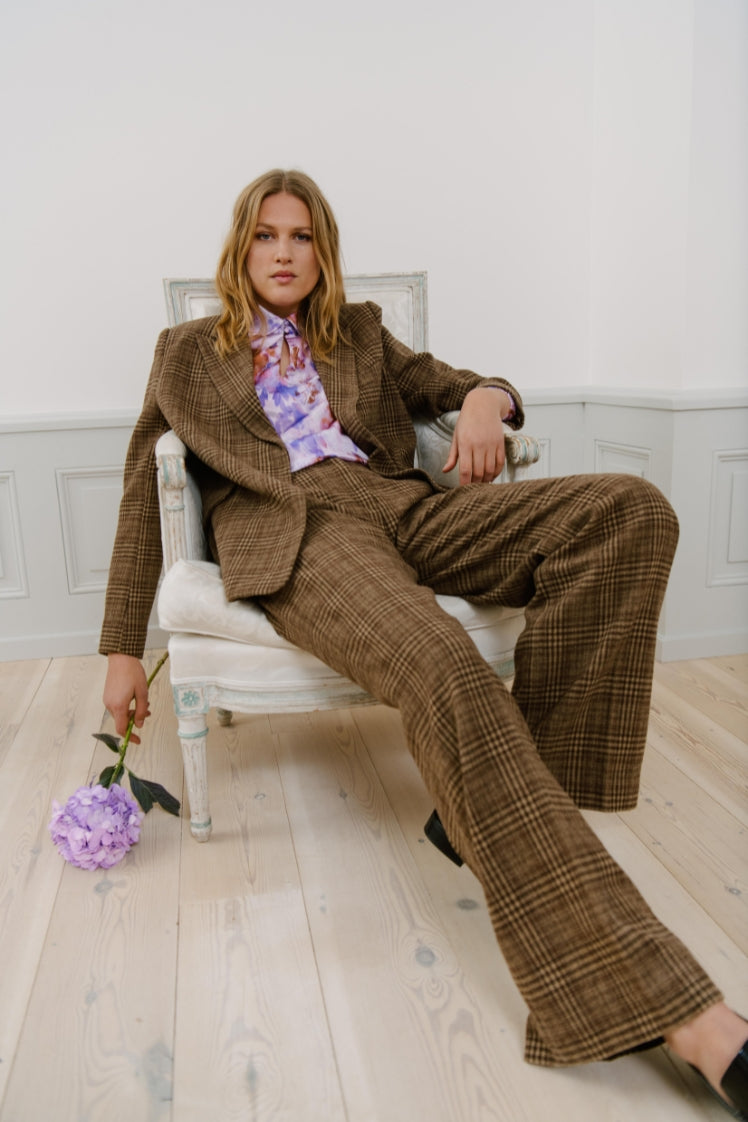 In der gesamten Kollektion ist das Spiel zwischen Maskulinem und Femininen von zentraler Bedeutung. Eine weiße Popelinebluse, die an das Hemd eines Künstlers erinnert, hat einen hohen Kragen und voluminöse Ärmel und harmoniert wunderbar mit jungenhaft weiten Hosen in Saville Row-Karo oder plissierten Hosen aus geschmeidigem Leder. Weibliche Akzente wie winzige bezogene Knöpfe, gerüschte Manschetten und offene Kanten bieten einen zarten Gegenpol zu lässigen Tweedblazern und ungefütterten, mit Gürtel versehenen Mänteln im Prince of Wales-Karo. Denim verliert sein Image als Arbeitskleidung und wird elegant und schick in einem vollen Rock oder einer Bandstand-Jacke – goldene Knöpfe sind ein humorvoller Hinweis auf Jeansnieten. Strickwaren spielen auch mit dem Kontrast zwischen künstlerisch und damenhaft, mit kreativen Fransen, die von den Schultern eines Rollkragenpullovers platzen, oder handgestickten Blumen, die den Kragen einer Strickjacke nachzeichnen, die neben einer zurückhaltenden, kurz geschnittenen Jacke aus strukturiertem Strick mit Korsagenblume steht. Schließlich sollte die Garderobe einer Frau alle Aspekte ihrer Persönlichkeit widerspiegeln.