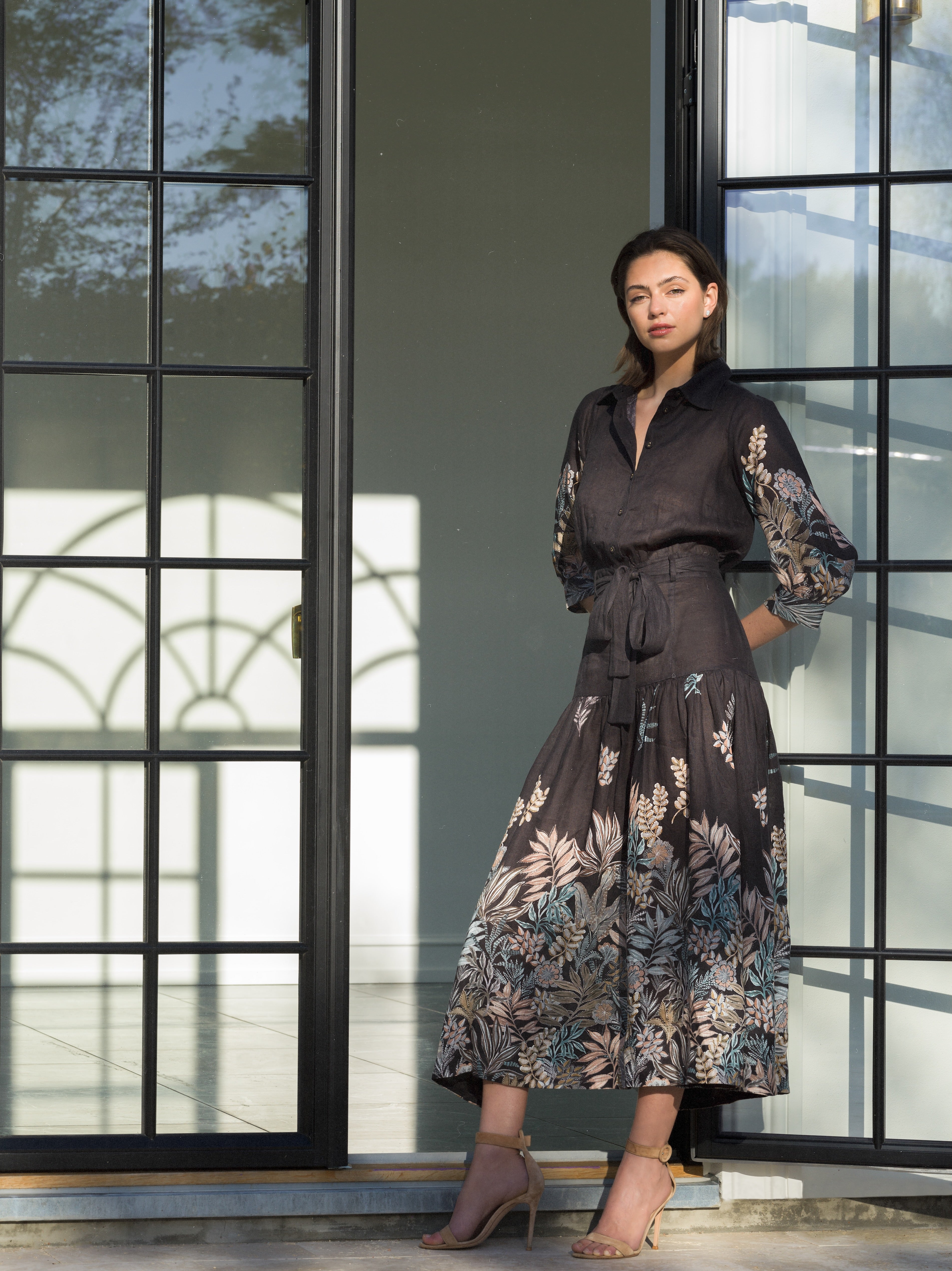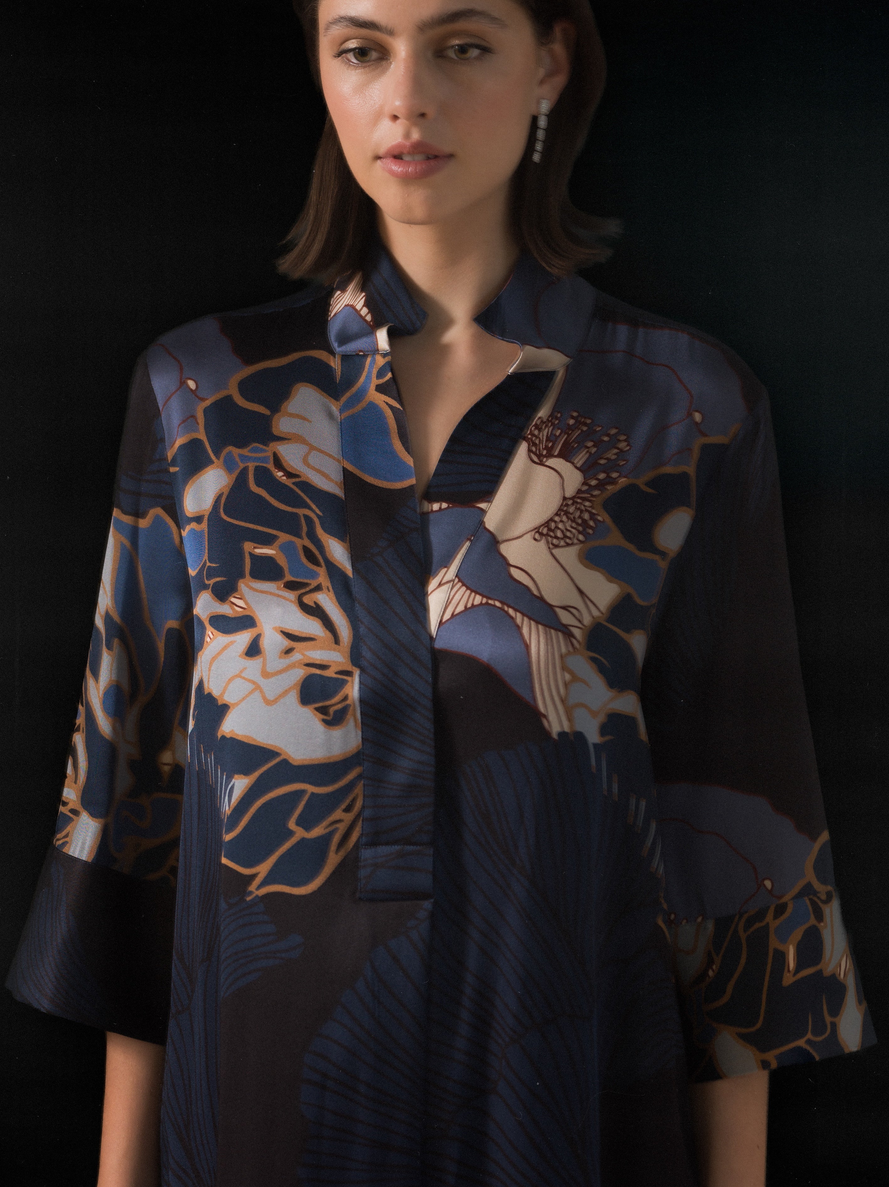 Diese Kollektion ist inspiriert von der stillen Anmut eines japanischen Gartens an einem herbstlichen Morgen. Blumen, Blätter und Bäume erscheinen durch den sanften Nebel weichgezeichnet – eine Szenerie von leiser Poesie. Zarte Farbnuancen wie Rosenwasserrosa, Porzellanweiß, Taubengrau und helles Blau fangen das Licht ein und verleihen den fließenden Seidenblusen wie auch den bedruckten Kleidern eine dezente und doch raffinierte Ausstrahlung. Kraftvolle, von Kimonos inspirierte Lotusblüten entfalten in sanften Blautönen eine neue, feminine Ausstrahlung. Farnblätter in warmen Herbstnuancen und Chrysanthemen, kombiniert mit Paisleymustern auf Jacquardstoffen, erzeugen dabei ebenso faszinierende Effekte. Anderswo zeigt sich die Kirschblüte in neuem Licht – in tiefen Indigo-Nuancen interpretiert, verleiht sie einem klassischen asiatischen Motiv eine frische, zeitgemäße Note.
