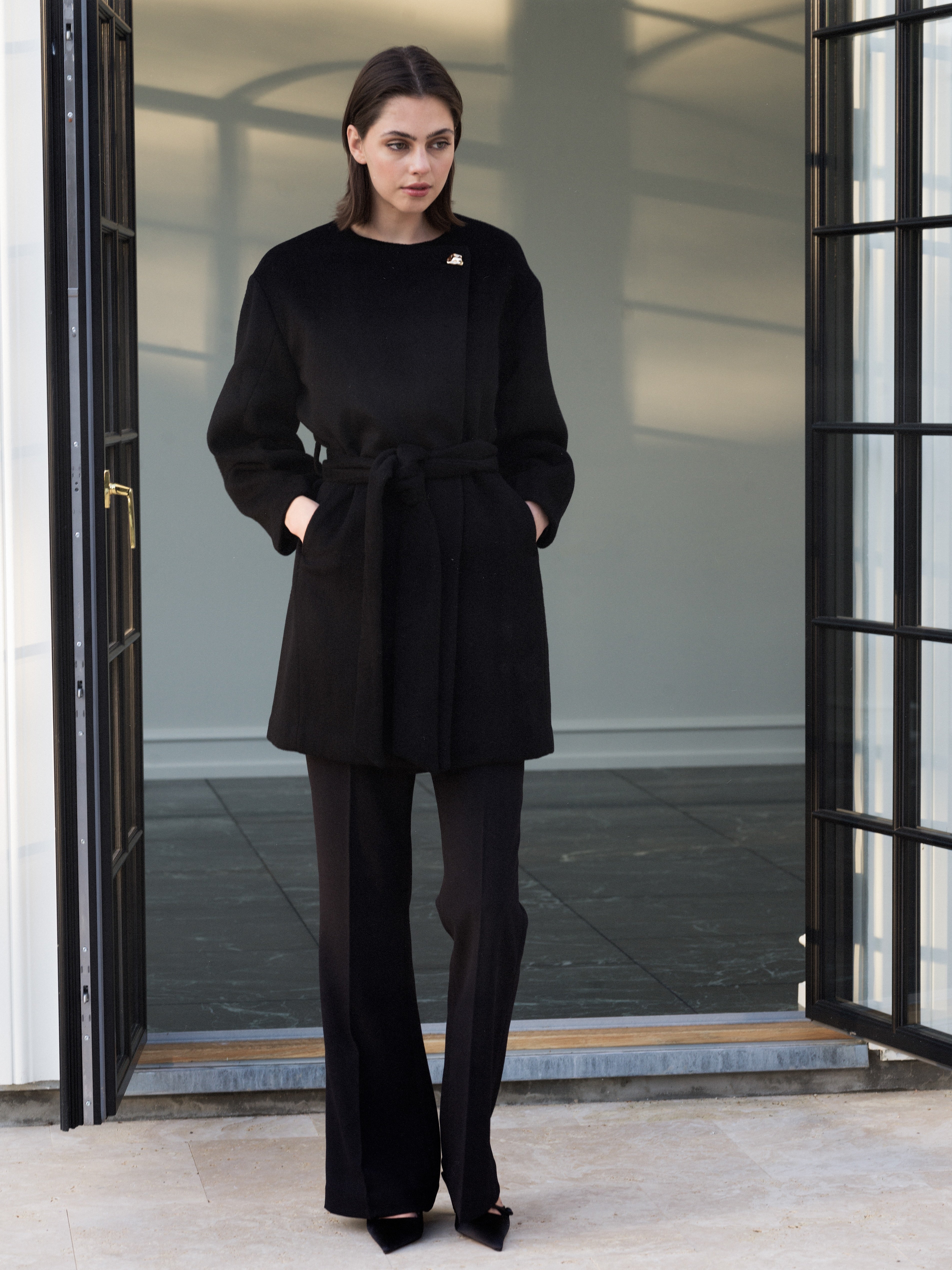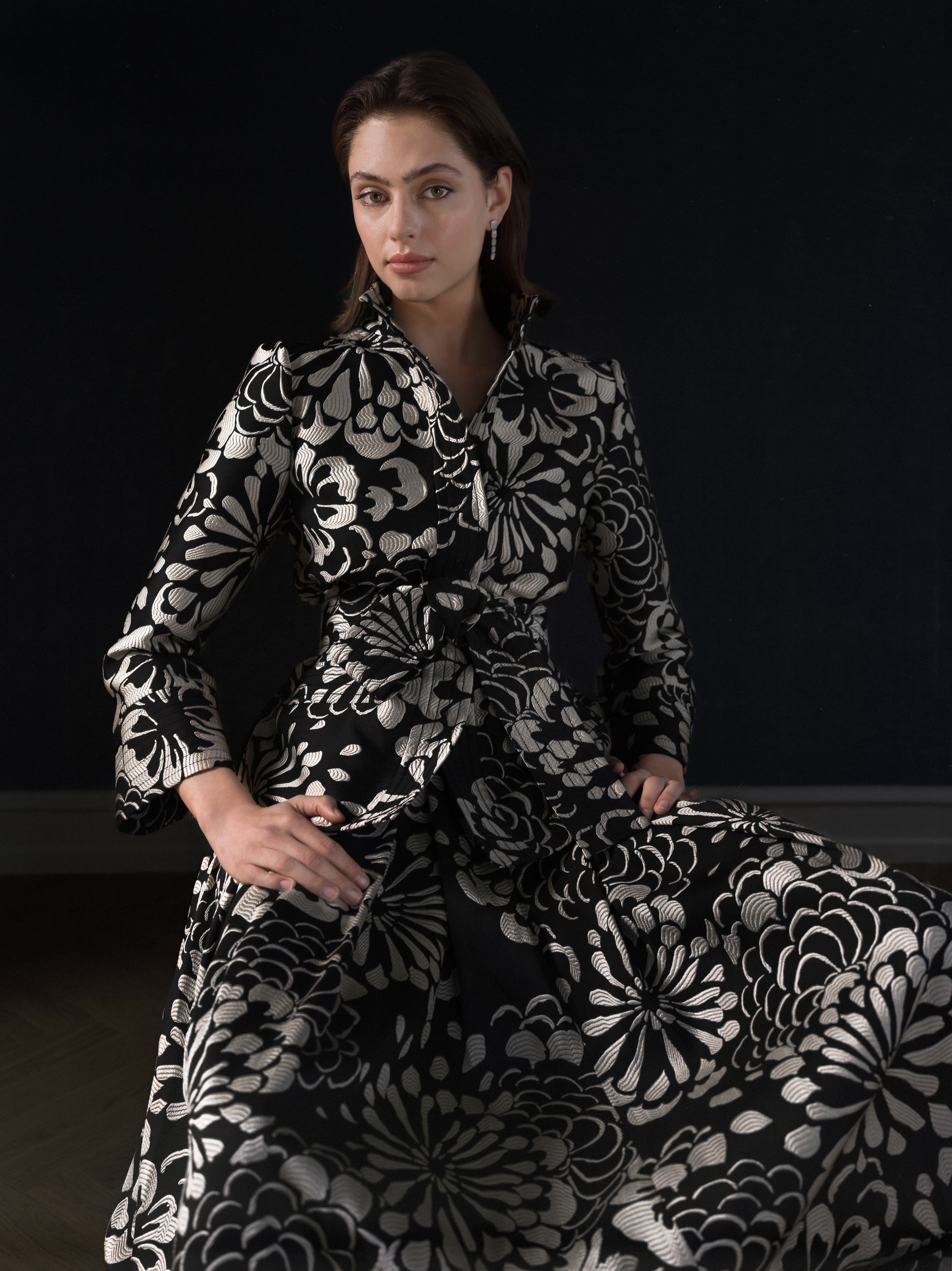 In dieser Saison setzt Schwarz ein kraftvolles Statement für einen eleganten, selbstbewussten Look.Ein Blazer aus luxuriöser Baumwolle mit architektonisch geformten Ärmeln bildet zusammen mit einer leicht verkürzten, schmal zulaufenden Hose eine markante Silhouette. Vegane Lederhosen, inspiriert vom Glanz fernöstlichen Lacks, wirken durch ihre skulpturale Linienführung besonders edel. Ein figurbetontes Kleid aus feinem, tiefschwarzem Wollmaterial umschmeichelt die Silhouette und wird durch einen Gürtel aus filigranen Rouleauschlaufen akzentuiert.Wenn der Abend anbricht, sorgt ein grafischer Chrysanthemen-Jacquard in Schwarz-Weiß für Aufsehen – als taillierte Jacke mit Bindegürtel und voluminösem Rock ein ausdrucksstarkes Ensemble voller Kontraste und Raffinesse.