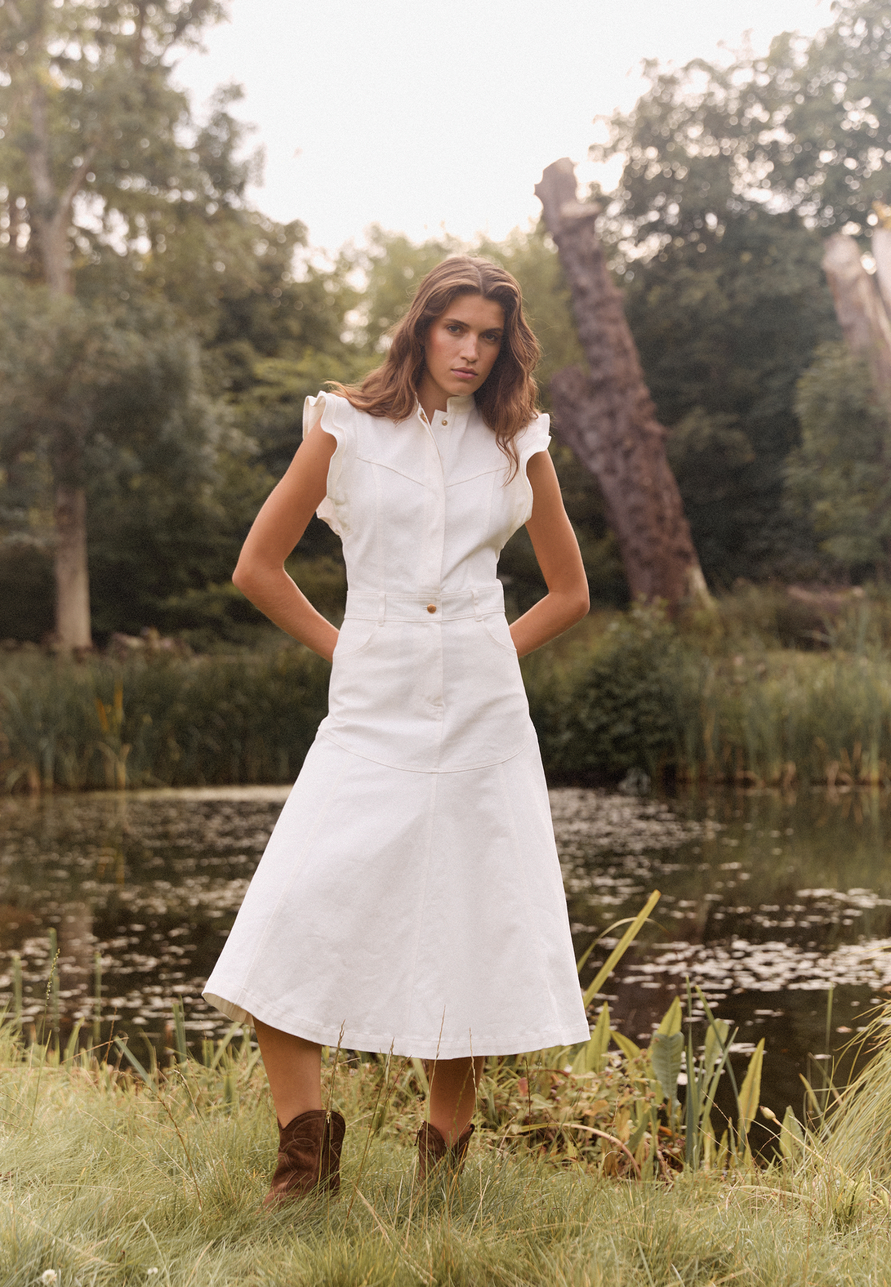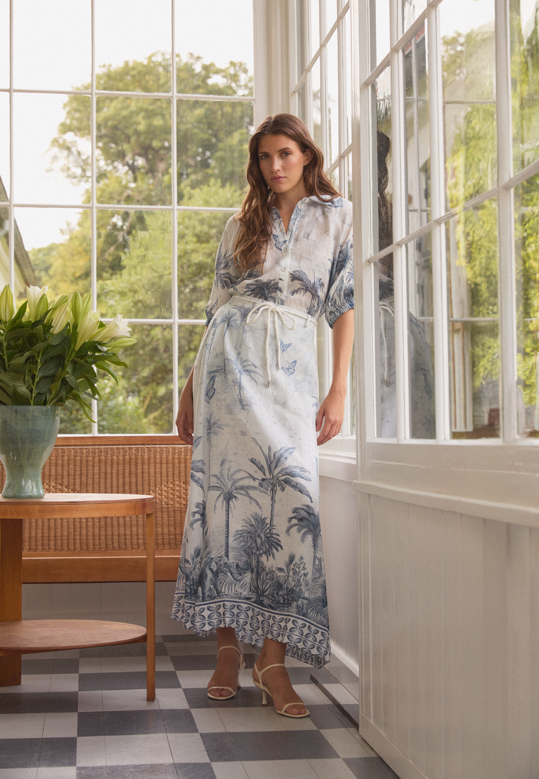 Die Stoffe werden etwas schwerer: Dunkler Indigo-Denim zeigt sich in einem ausgestellten Rock mit Jeans-Taschen oder – besonders reizvoll – in einer Jacke mit offenem Rücken, die mit Schleifen gebunden wird. Die Schneiderkunst erhält eine kühle, maskuline Note mit entspannten, doppelreihigen Blazern, kombiniert mit klassischen Faltenhosen im marineblauen Fensterkaromuster, während die Schönheit eines Gartens in gestickten Blumen und Schmetterlingen auf einer Twillhose lebendig wird. Gestreifte Hemdenstoffe wirken weicher in Form eines langen Hemdblusenkleids oder eines Shirts mit Schleifenverschlüssen an den Manschetten. Die Kombination aus Voile und Spitze aus der Sommerkollektion kehrt zurück, diesmal jedoch in Form eines Leinenkleides mit zartem Einsatz am Joch und einer Taille, die mit einem Rattan-Gürtelschnalle gebunden wird. Diese Hommage an traditionelle Handwerkskunst findet sich auch in einem gestrickten Pullover und einer Strickjacke wieder, beide verziert mit handbestickten Blumen. Denn letztlich stehen Kreativität und Individualität im Mittelpunkt der Kollektion – und im Herzen der Dea Kudibal Frau.