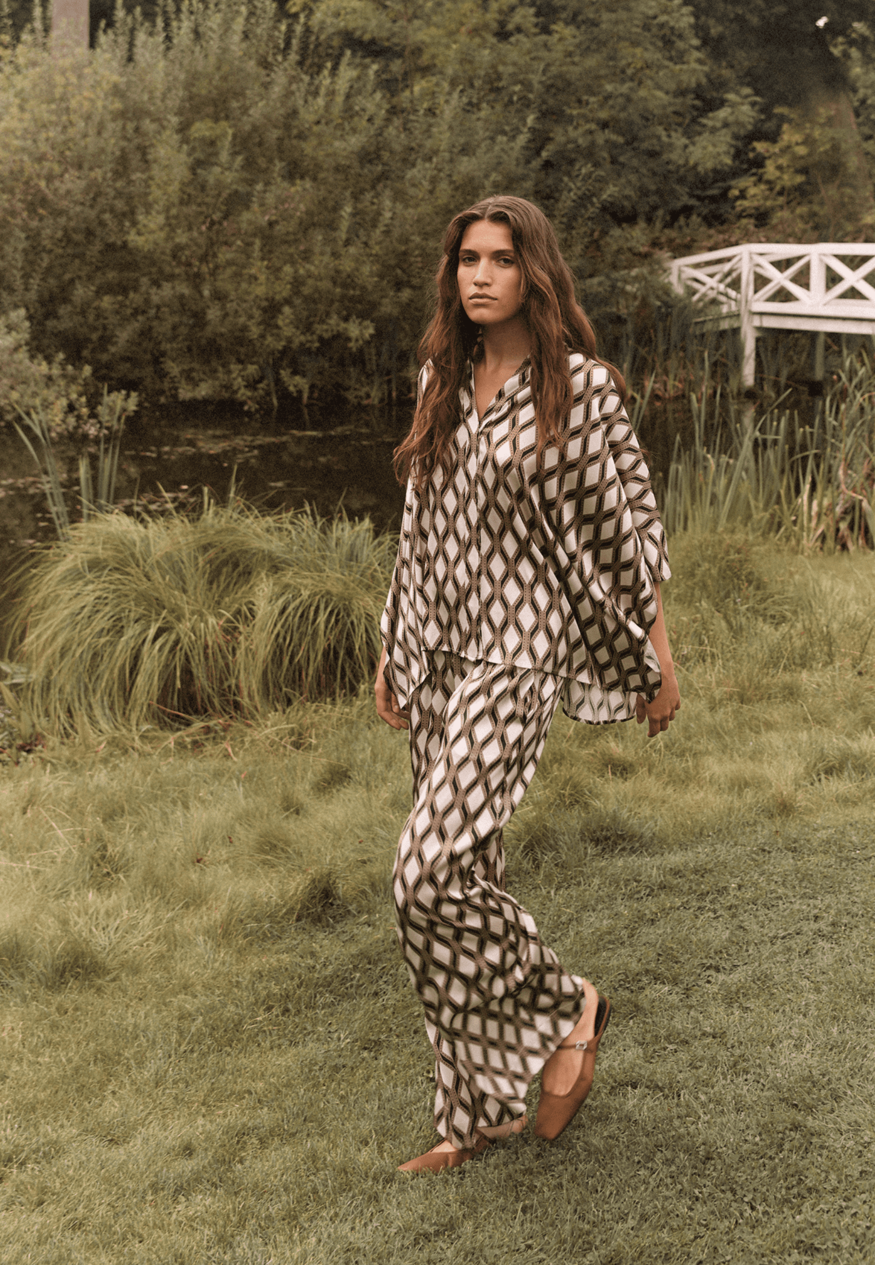 Inspiriert von der kargen Farbpalette ihres afrikanischen Zuhauses, setzt die Farbwelt für den Sommer 2025 auf verbranntes Rot und lebhaftes Himmelblau im Kontrast zu natürlichem Sand, Knochenweiß und Schwarz. Die charakteristischen Prints von Dea Kudibal vereinen den künstlerischen Charme eines handgemalten Blumenbaumes, ein mutiges, von Ikat inspiriertes Design und einen zarten, platzierten Druck mit Karten und Wildtieren, während grafischere Muster von traditioneller Flechtkunst inspiriert sind. Die Stoffe sind perfekt für heiße Tage und warme Abende: Ein Kaftan oder eine lange Bluse aus leichter Baumwollvoile mit Cut-out-Spitze und Taillierung durch einen Kordelgürtel wirkt stilvoll und mühelos zugleich, während weiße Denim-Stoffe in Form von verkürzten Hosen oder einem Hemdblusenkleid mit Volantärmeln Nützlichkeit mit Weiblichkeit vereinen. An anderer Stelle verleiht ein kompakter Twill in Savannen-Beige einem Safari-Kleid mit Taillengürtel oder einer kurzärmeligen Blusenjacke einen coolen Retro-70er-Jahre-Vibe. Am Abend zeigt sich entspannte Eleganz in einem fließenden, bedruckten Georgette-Kleid mit Cut-out-Schultern oder, für mehr Dramatik, in einem leuchtend farbigen One-Shoulder-Top mit überdimensionaler Rüsche. Sollte die Luft kühler werden, wenn die Sonne untergeht, sorgt ein Pointelle-Strick mit zarter Spitze für einen Hauch sonnengeküsster Haut und ein schön betontes Schlüsselbein. Wenn der Sommer langsam in den Herbst übergeht, fließt die Kollektion nahtlos in die Pre-Fall-Linie über, die sich auf Karen Blixens Leben in Dänemark konzentriert. Die Farbpalette spiegelt den Ortswechsel wider: Erdige Töne wie Pilz und Piniengrün mischen sich mit tiefem Mitternachtsblau und frischem skandinavischen Blau.
