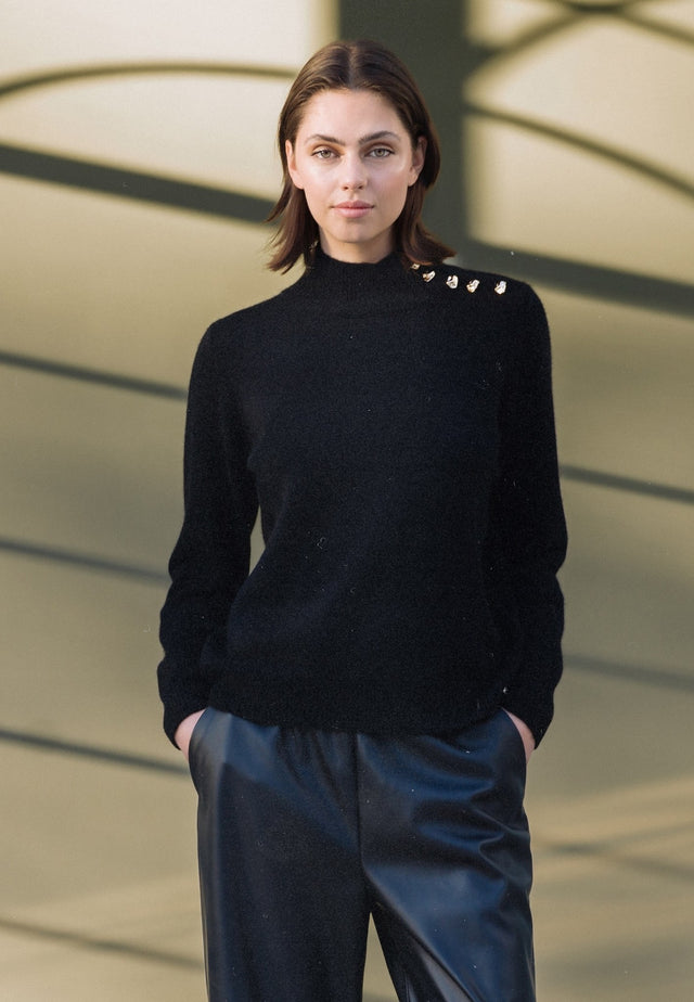 Nichts übertrifft das luxuriöse Gefühl von reinem Kaschmir auf der Haut, und dieser tiefschwarze Pullover fühlt sich genauso gut an, wie er aussieht. Er ist bequem und hat einen Rollkragen mit dekorativen Messingknöpfen an der Schulter. Saum und Ärmel sind mit einem breiten Rippbündchen versehen.