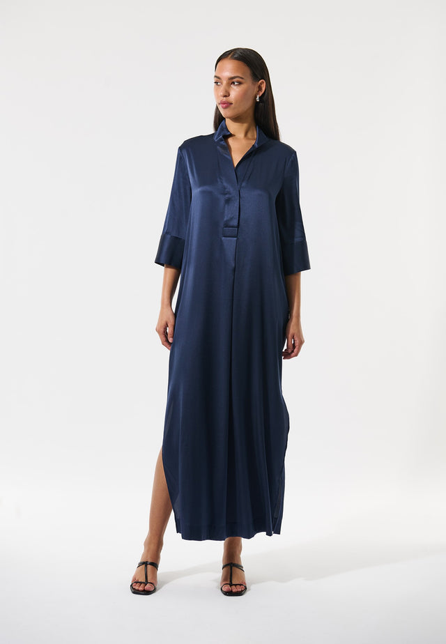 Ein wahrer Dea Kudibal-Klassiker: Helga ist ein locker geschnittenes, langes Kleid mit einem Kimono-Ausschnitt, Stehkragen und 3/4-langen, weiten Ärmeln. Diese Version ist aus einer eleganten navyblauen Seide gefertigt, die sowohl tagsüber als auch abends getragen werden kann.