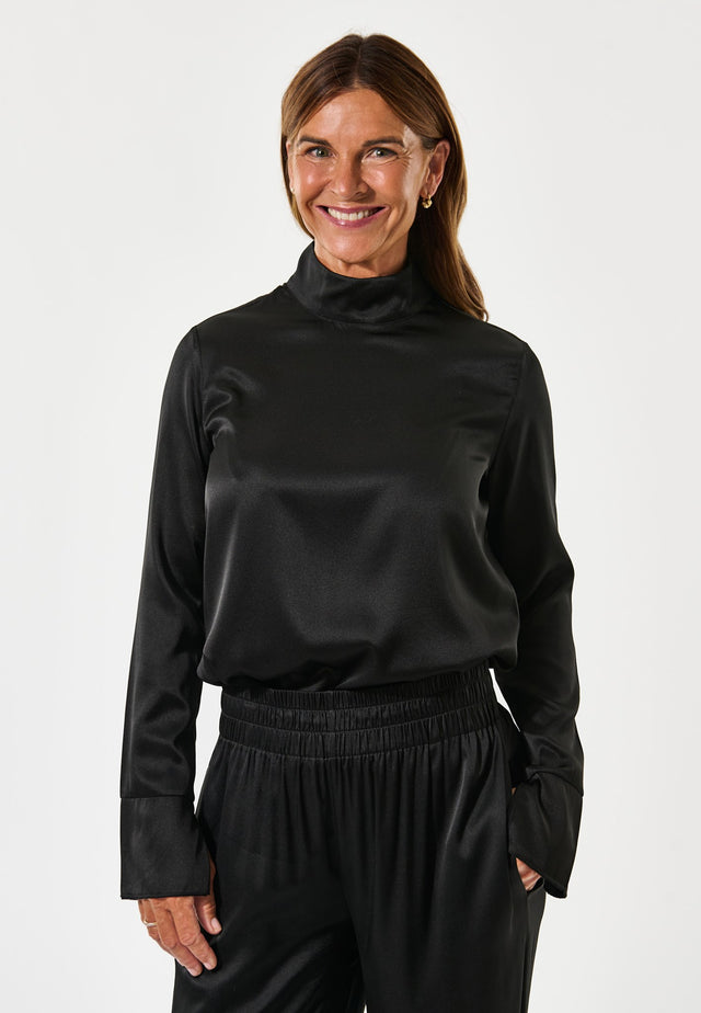 Minimalistisch und zugleich ausgesprochen elegant präsentiert sich dieses tiefschwarze Oberteil aus edlem Seidentwill. Die langen Ärmel und die körperbetonte Silhouette machen es zu einem vielseitigen Styling-Partner – sei es als Kontrast zu einem gemusterten Rock oder einer Hose, oder als raffiniertes Layering-Piece unter einem Blazer. Ein verdeckter Reißverschluss im Nacken rundet das dezente Design ab.