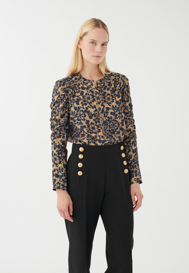 Sanfte Rüschen verlaufen entlang der Ärmel dieser Rundhals-Viskosebluse. Der Druck von schwarzen Blumen auf einem natürlichen Untergrund ist raffiniert und schick.