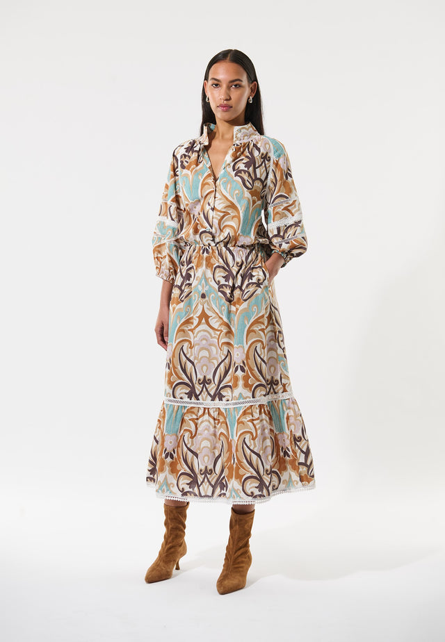 Wirklich eine großartige Wahl für den Sommer: Dieses bodenlange, regulär geschnittene Kleid aus Art Nouveau-inspiriertem, bedrucktem Baumwoll-Voile ist leicht, bequem und völlig feminin. Zarte Spitzenbänder schmücken den gestuften Rock und die voluminösen Ärmel, während der Stehkragen und die Knopfleiste auf der Vorderseite seinen Reiz noch verstärken.