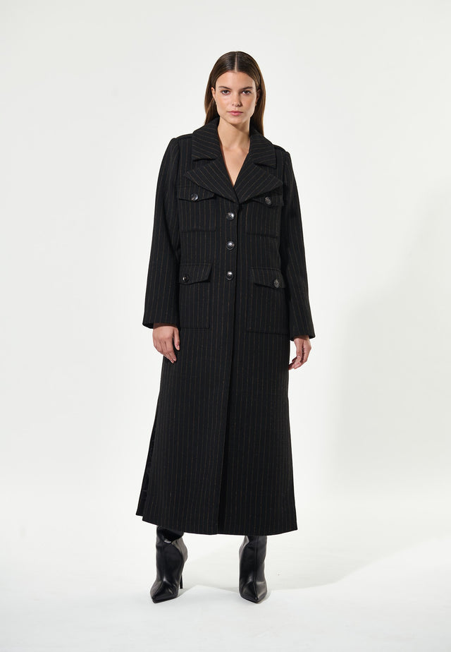 Dieser elegante Mantel aus schwarzem Nadelstreifen-Wollmischgewebe mit langer Linie und schmaler Passform strahlt Dramatik aus. Breite Revers, vier aufgesetzte Pattentaschen und drei hoch sitzende Messingknöpfe runden die Vorderseite ab, während Schulterklappen und Schulterpolster die Silhouette betonen. Der Mantel ist komplett gefüttert.
