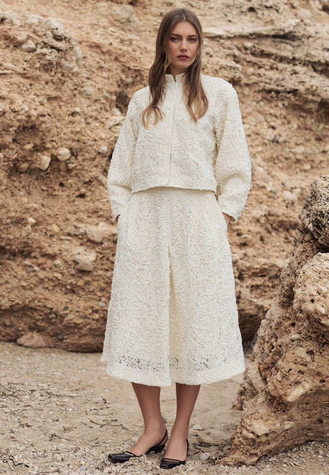Dieser figurbetonte Rock geht in eine elegante A-Linie über, die bis zur Mitte der Wade reicht. Die feine cremefarbene Spitze steht im Fokus. Eine große Frontfalte sorgt für Bewegungsfreiheit. Verdeckter Reißverschluss hinten, komplett gefüttert.
