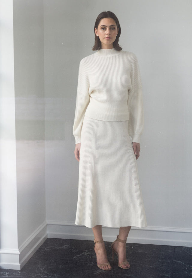 Dieser gemütliche und stilvolle Rippstrickrock in Wadenlänge liegt eng an den Hüften an und wird dann mit zarten Details ausgestellt. Er hat einen elastischen Bund für zusätzlichen Komfort und besteht aus einer Mischung aus Wolle, Baumwolle und Kaschmir in einem satten Cremeton.