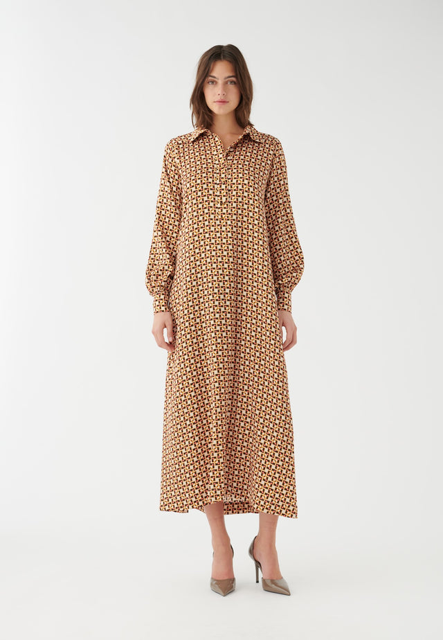 Ballonärmel und eine sanft ausgestellte Form verleihen diesem Kleid eine entspannte, aber stilvolle Silhouette. Ein Hemdkragen und Seitentaschen verstärken den Eindruck von lässiger Eleganz, und der optische Druck in leuchtenden Farben ist ein perfek
