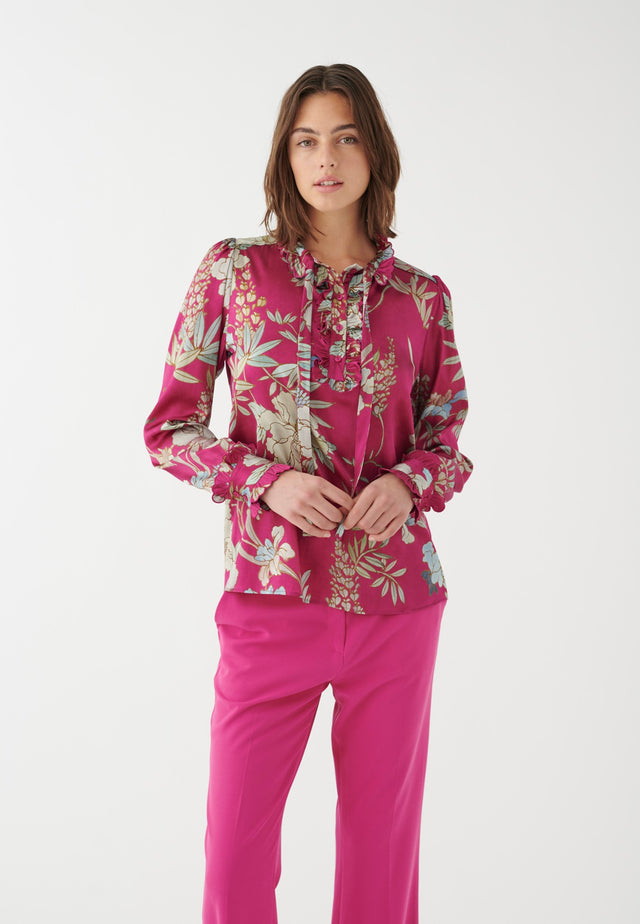 Zarte Rüschen umrahmen den Kragen, die Bündchen und die vordere Knopfleiste dieser Seidenbluse und verleihen ihr eine feminine und chice Note. Der kräftige Druck von Blumen auf einem leuchtend pinkfarbenen Hintergrund macht sie zu einem echten Hinguc