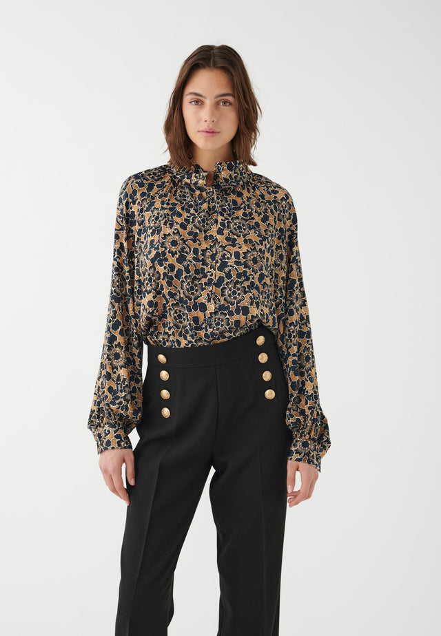 Kleine Fältchen ziehen den Körper dieser bedruckten Seidenbluse in einen hohen Stehkragen, während volle Ärmel zur eleganten Silhouette beitragen. Der dezente Blumenprint macht die Bluse perfekt für Tag und Abend.