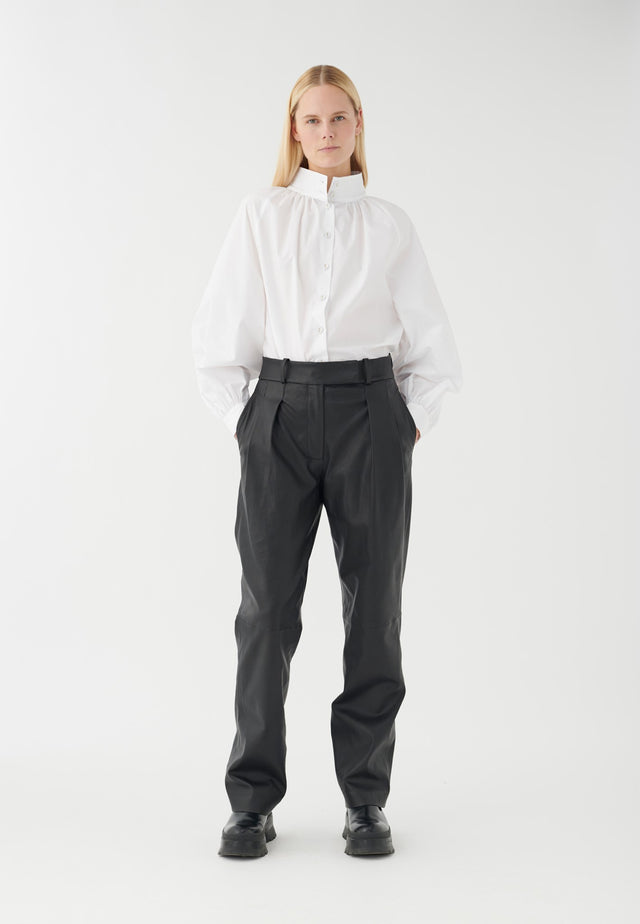 Schwarze Lederhosen sind ideal für den Winter, da sie sowohl stilvoll als auch praktisch sind. Diese Version aus Stretchleder hat eine lockere Passform mit Falten, die ein Gefühl der Bequemlichkeit verleihen. Sie funktionieren hervorragend mit einem