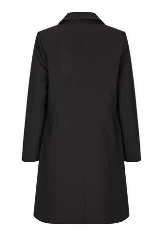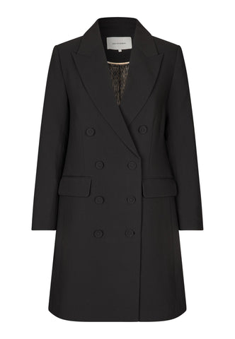 Fachmännisch geschneidert wie ein Blazer, aber als kurzes Kleid getragen – eine stilvolle Neuinterpretation des klassischen Smokings. Der zweireihige Verschluss, das breite Speerrevers und die stoffbezogenen Knöpfe auf tiefschwarzem Viskosemisch-Krepp wirken elegant und raffiniert. Komplett gefüttert mit Monogramm-Print.
