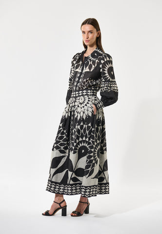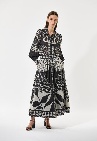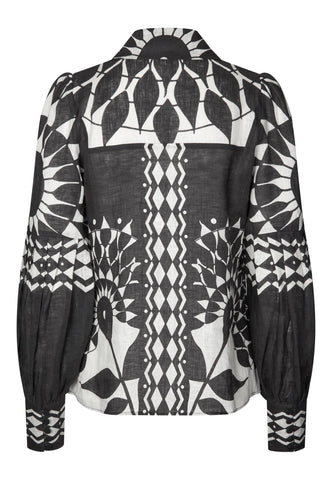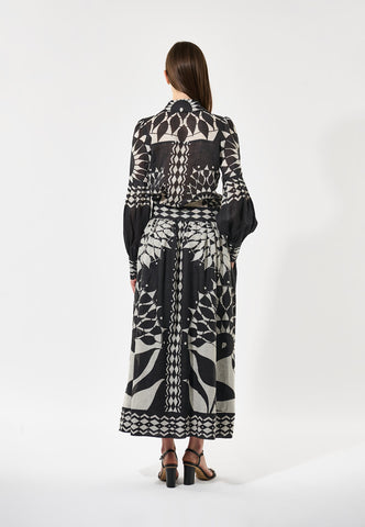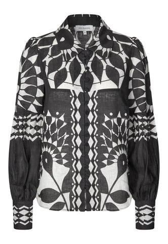 Ein auffälliger schwarz-weißer Grafikdruck verleiht diesem weichen Leinenhemd echte Präsenz. Die langen Ärmel betonen die Silhouette, während kleine Stoffknöpfe mit Schlaufen einen stilvollen Abschluss bieten.