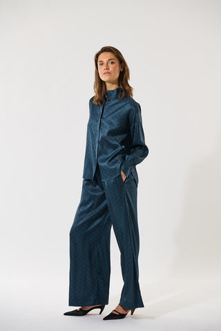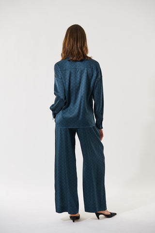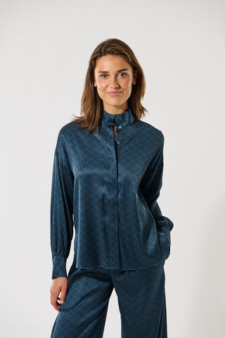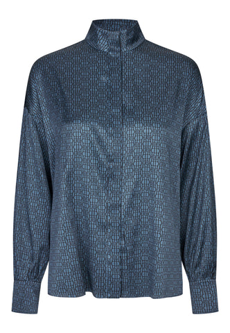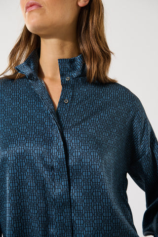 Die verdeckte Knopfleiste mit Hosenschlitzoptik verleiht diesem Hemd aus Seidentwill mit Stehkragen eine cleane, minimalistische Ästhetik. Der abstrakte Monogramm-Print auf dunkelblauem Grund sorgt für grafische Raffinesse.