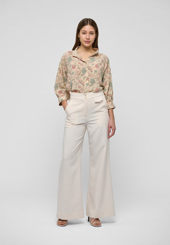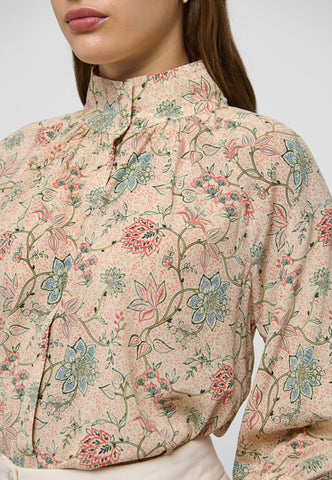 Mit seinem Print aus zartfarbenen Blumen wirkt dieses Seidenhemd lässig und dennoch elegant. Der Körper ist vorne und hinten mit feinen Fältchen gerafft und geht in einen hohen Stehkragen mit Mehrfachsteppung über, dazu kommen weite 3/4-lange Ärmel.