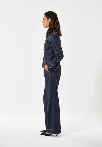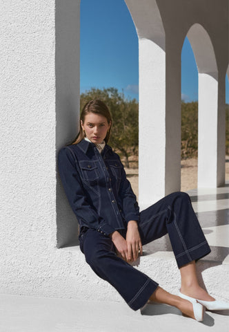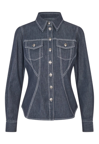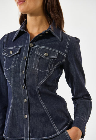 Kontrastnähte setzen weibliche Kurven bei diesem taillierten Jeanshemd gekonnt in Szene. Doppelnähte, Pattentaschen und Metallknöpfe mit Logo verleihen ihm eine moderne Interpretation des klassischen Western-Looks.