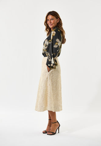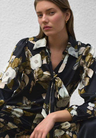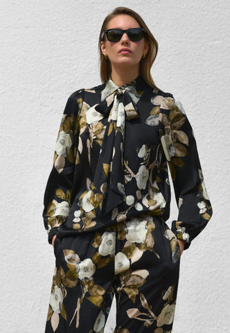 Diese edle Bluse aus schwarzer Seide, bedruckt mit weißen Kamelienblüten, setzt mit einer abnehmbaren Schleife am Hals ein stilvolles Statement. Die normale Passform wird durch elastische Bündchen mit feiner Rüsche charmant ergänzt. Verdeckte Knöpfe am Hals über einem dezenten Schlüssellochschlitz runden das raffinierte Design ab.