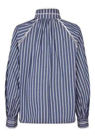 Zarter Spitzenbesatz ziert Stehkragen, Manschetten, Knopfleiste und Schulternähte dieser stilvollen Bluse. Der auffällige Streifenstoff aus Chambray-Baumwollmischung verleiht ihr einen modernen Twist.