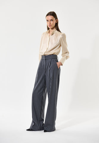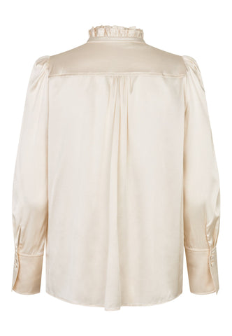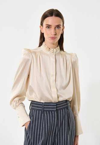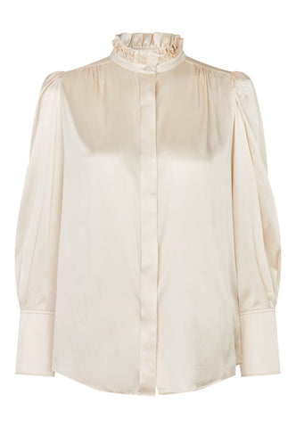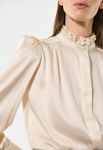 Diese elegante Bluse überzeugt durch zwei Rüschenlagen, einen hohen Stehkragen und verdeckte Knöpfe vorn. Feine Biesen schmücken Vorder- und Rückseite am Halsausschnitt. Gefertigt aus edlem cremefarbenem Seidentwill – ein zeitloser Klassiker.