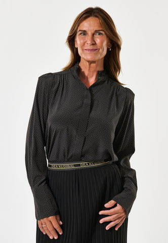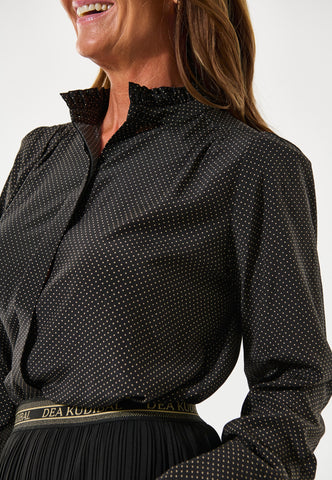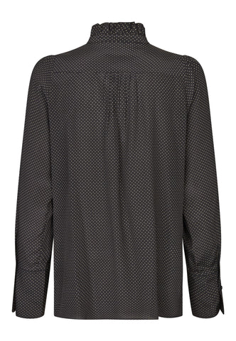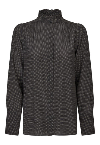 Diese stilvolle Bluse mit doppelten Rüschen, Stehkragen und verdeckter Knopfleiste ist aus schwarzer Seide mit feinem weißen Nadelpunktmuster gefertigt. Zarte Biesen am Halsausschnitt verleihen ihr einen femininen Touch.
