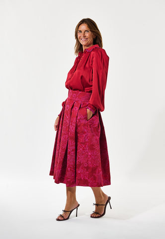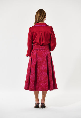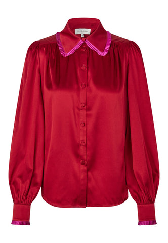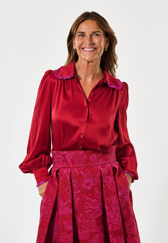 Ein zarter Rüschenbesatz in kräftigem Fuchsia-Rosa setzt verspielte Akzente an Kragen und Manschetten dieses leuchtend roten Seidenhemdes. Die Bluse wird vorne mit eleganten, verdeckten Knöpfen geschlossen, während voluminöse Ärmel und feine Raffungen an der vorderen Passe dem Design eine raffinierte Leichtigkeit verleihen.