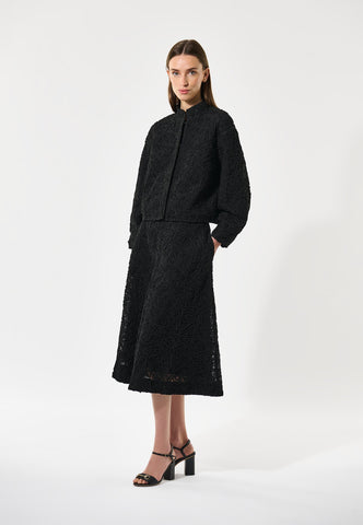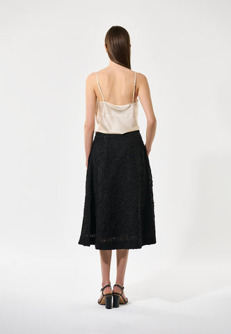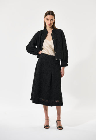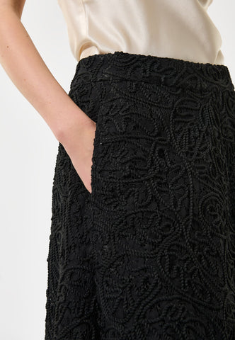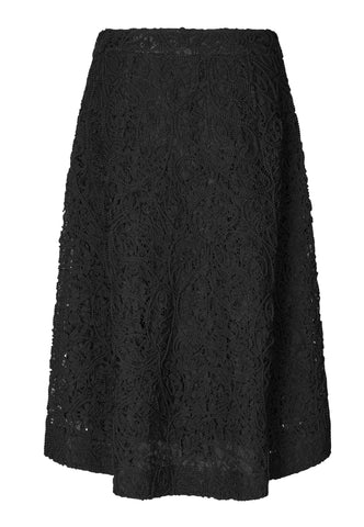 Dieser Rock liegt eng an der Hüfte an und weitet sich zu einer eleganten A-Linie bis zur Mitte der Wade. Die schwarze Spitze verleiht ihm Raffinesse. Eine große Falte vorne sorgt für Bewegungsfreiheit. Mit verdecktem Reißverschluss hinten, komplett gefüttert.