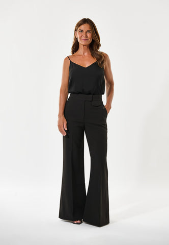 Diese schwarze Hose aus Viskosemischung sitzt schmal an der Hüfte und fällt dann leicht ausgestellt. Ein kleines, überraschendes Detail: Ein Schlitz an der Fersenrückseite gibt dezent den Knöchel frei. Verschluss mit Reißverschluss, Haken und Steg sowie Pattentasche vorn.