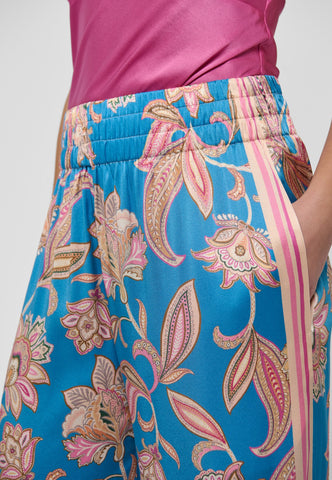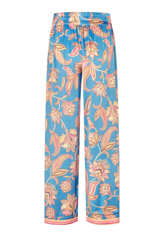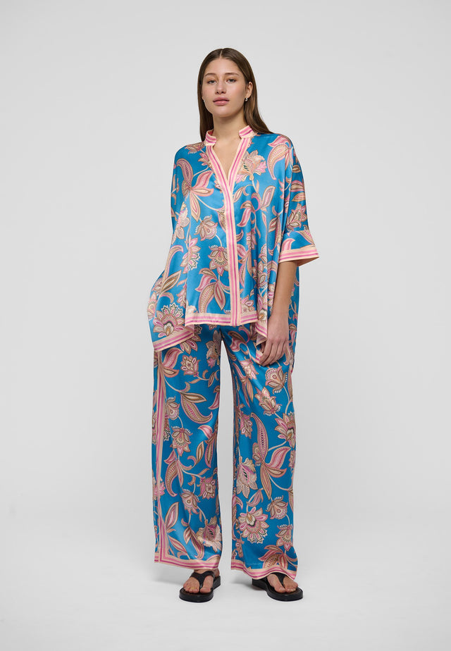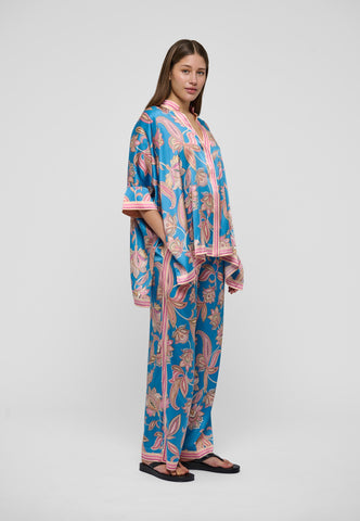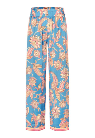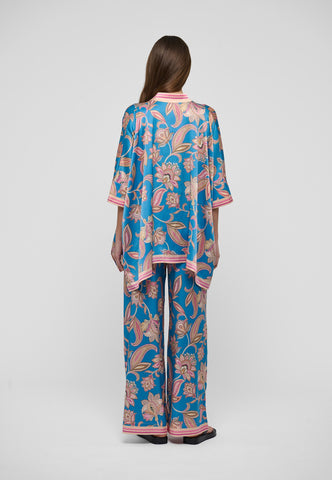 Weite Seidenhosen sind ein Dea-Kudibal-Liebling – dieses Paar mit kräftigem Blumenprint auf leuchtend blauem Grund ist ein tolles Beispiel. Mit schlichtem Top oder Strick für einen mühelos stilvollen Look.