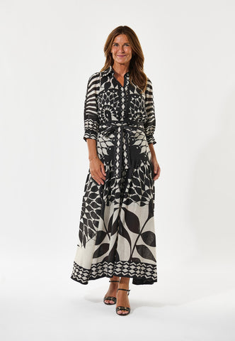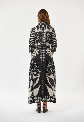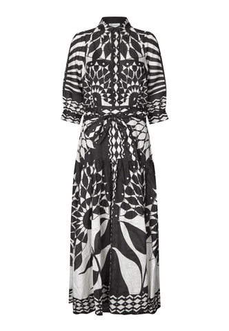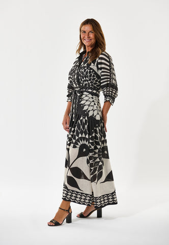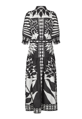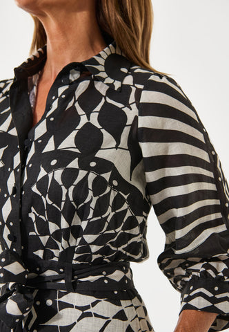 Ein schwarz-weißer Grafikprint macht dieses Leinenkleid zum Hingucker. Das taillierte Oberteil mit klassischem Hemdkragen und ¾-Ärmeln geht in einen ausgestellten Volantrock über, der durch einen Bindegürtel aus demselben Stoff akzentuiert wird. Seitlicher Reißverschluss.