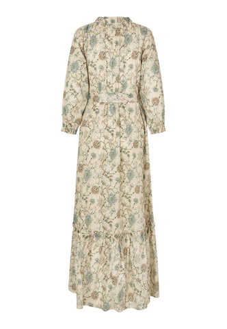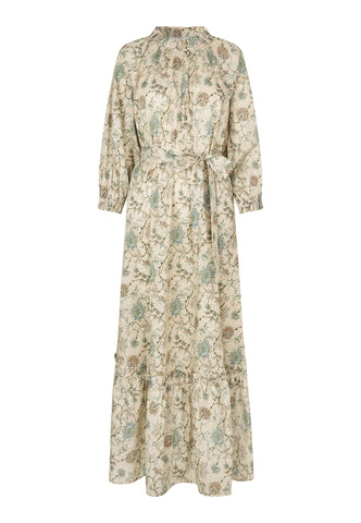 Kleine Rüschen verlaufen entlang des Kragens, an den Manschetten und entlang der Volantnaht des Rocks bei diesem bodenlangen Kleid aus Baumwollvoile mit floralem Print. Ein Bindegürtel betont die Taille, kleine stoffbezogene Knöpfe laufen vorne hinunter, und seitliche Taschen sorgen für einen lässigeren Look.