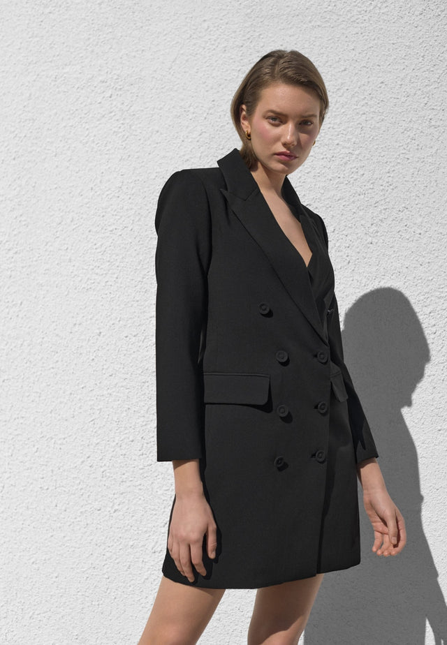 Fachmännisch geschneidert wie ein Blazer, aber als kurzes Kleid getragen – eine stilvolle Neuinterpretation des klassischen Smokings. Der zweireihige Verschluss, das breite Speerrevers und die stoffbezogenen Knöpfe auf tiefschwarzem Viskosemisch-Krepp wirken elegant und raffiniert. Komplett gefüttert mit Monogramm-Print.