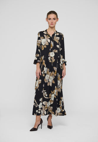 Dieses feminine, leicht zu tragende Kleid aus Viskose-Crêpe zeigt ein zartes Kamelienmuster auf dunklem Hintergrund. Es fällt locker, besitzt einen Rundhalsausschnitt, eine vordere Knopfleiste sowie gerüschte Manschetten. Praktische Seitentaschen runden den Look ab.