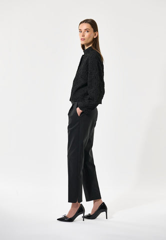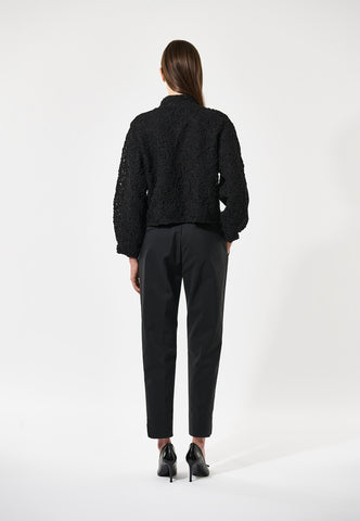 Diese beeindruckende Jacke setzt auf dezenten Schnitt, um den edlen schwarzen Spitzenstoff wirken zu lassen. Kurzer, taillierter Schnitt mit Druckknöpfen vorn, Stehkragen und skulpturalen Ärmeln. Ideal in Kombination mit dem passenden Alma-Rock für einen besonderen Look.
