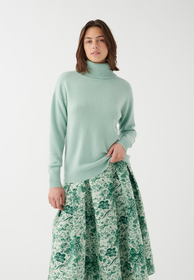 Ein klassischer Kaschmirpullover mit hohem Kragen ist immer in Mode. Die Kombination aus luxuriöser Weichheit, elegantem Mintgrün und schnörkellosen, minimalistischen Linien macht ihn zu einem großartigen Beispiel für zeitlosen Chic.