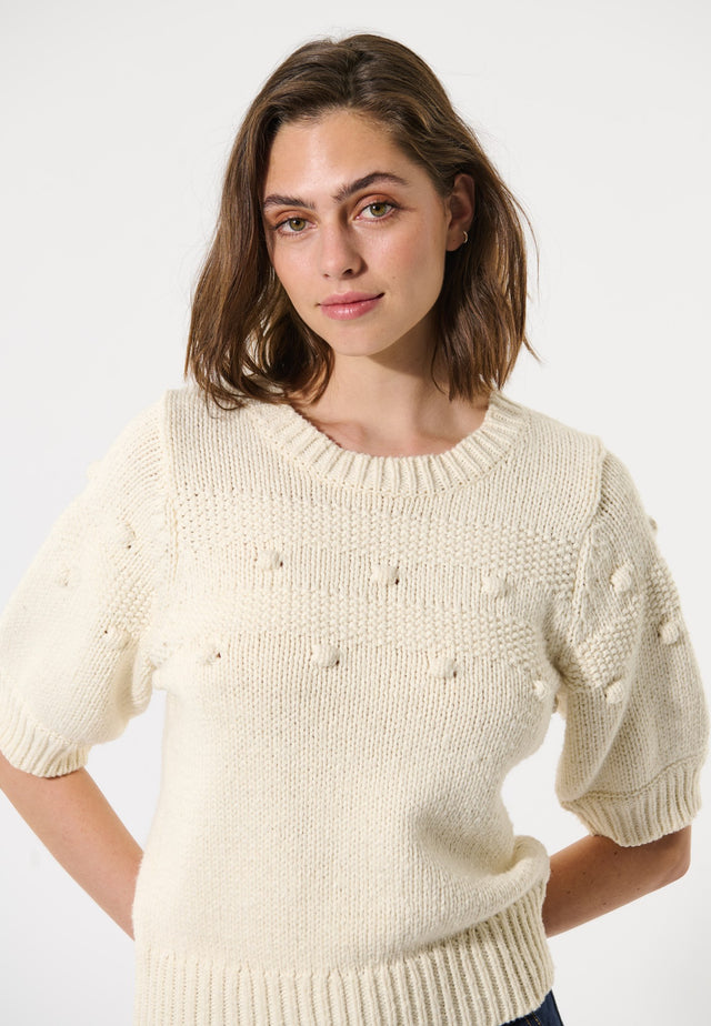 Ordentlich und stilvoll, dieser taillierte Pullover aus einem naturweißen Baumwoll-Woll-Mix hat kurze Puffärmel, die ihm einen Hauch von Retro-Charme verleihen. Die horizontalen, strukturierten Streifen zeigen 3D-Punkte, die dem Pullover ein dezentes Detail verleihen.
