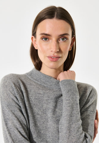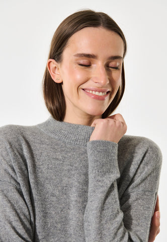 Ein Rundhalspullover aus Kaschmir ist ein Klassiker im Kleiderschrank. Diese graue Version hat feine Rippabschlüsse an Hals, Saum und Bündchen sowie ein kleines gesticktes Logo im Nacken – schlicht, elegant und zeitlos.