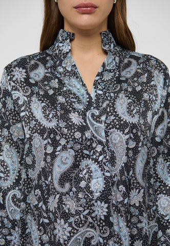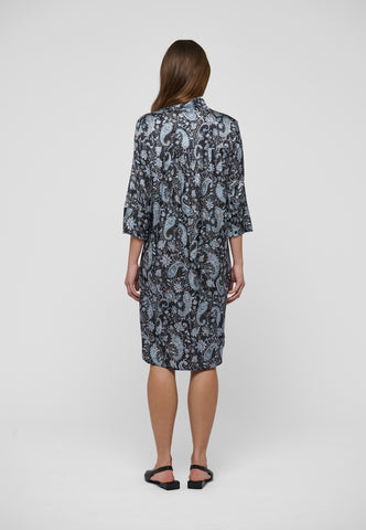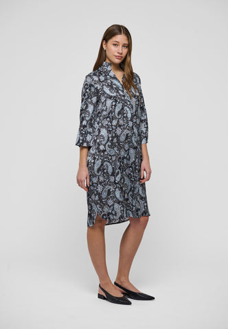 Als einer der beliebtesten und zeitlosesten Styles von Dea Kudibal ist dieses unkompliziert geschnittene, wadenlange Kleid perfekt für jede Figur. Der kimonoartige Ausschnitt und der Kragen verleihen ihm Eleganz, während die tiefen Ärmel mit stoffbezogenen Knöpfen eine lässige Note haben. Diese wunderschöne Version ist aus schwarzer Seide gefertigt und allover mit blauen Paisleys bedruckt.