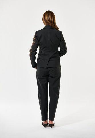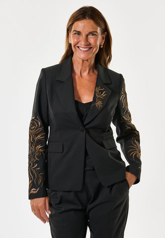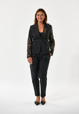 Zart gestickte Blätter und Blüten in Kupfer- und Goldtönen schmücken Ärmel und Revers dieser Jacke – und machen sie zu einem echten Highlight. Der luxuriöse Blazer aus Baumwollmischung ist tailliert geschnitten, hat zwei Pattentaschen und wird mit einem kunstvoll bestickten Knopf geschlossen. Komplett gefüttert. Perfekt kombinierbar mit der passenden Cametti-Hose.