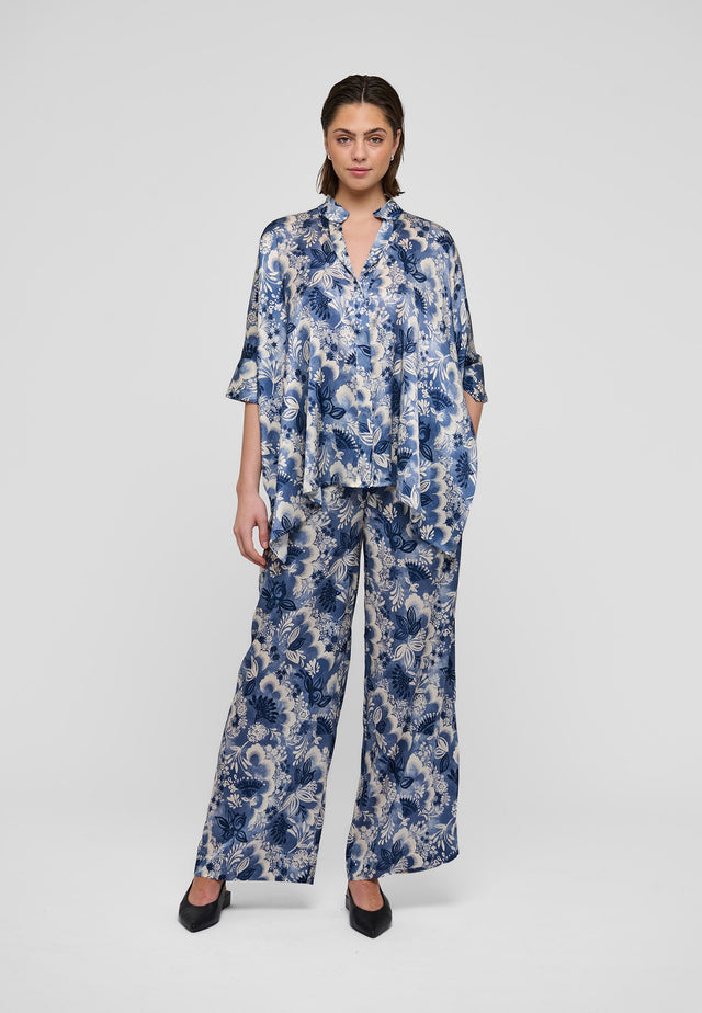 Oversized und unkompliziert zu tragen: Diese sehr weit geschnittene Seidenbluse mit einem wunderschönen Print blauer Blumen hat 3/4-lange Ärmel, eine verdeckte Knopfleiste und einen kleinen Stehkragen. Tragen Sie sie mit Jeans für einen lässigen Tageslook – oder kombinieren Sie sie abends mit einem Rock für einen eleganteren Auftritt.