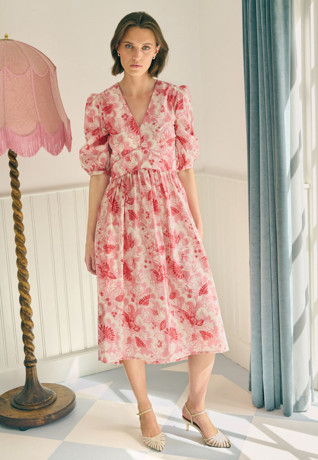Ein taillierter Formeinsatz an der Taille, betont durch Kontrastpaspeln, akzentuiert die Figur bei diesem schönen Kleid aus Baumwollvoile mit V-Ausschnitt, bedruckt mit exotischen Blumen in Pink und Rot. Weite, ellenbogenlange Ärmel unterstreichen die feminine Silhouette, ebenso wie der ausgestellte Rock, der bis zur Wadenmitte fällt.