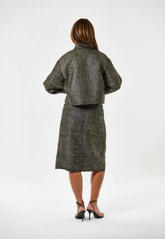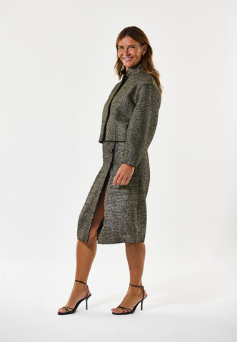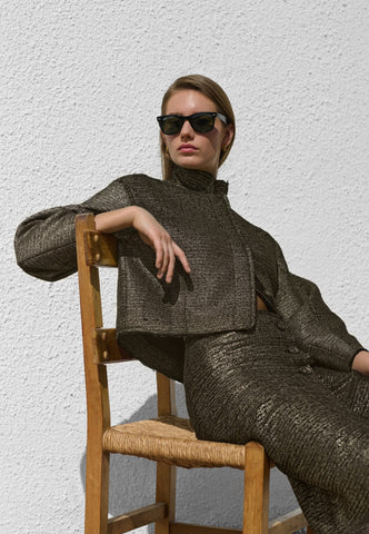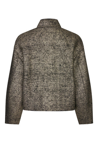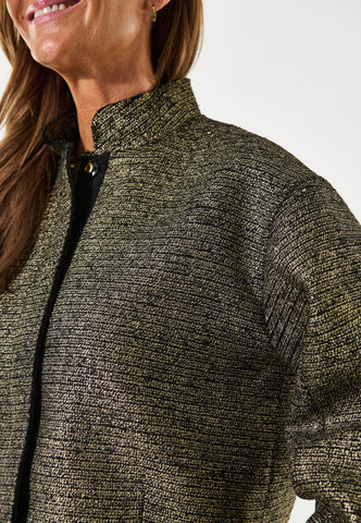 Zurückhaltende Details dieser stilvollen Jacke lassen das beeindruckende goldene Bouclé-Gewebe für sich sprechen. Die Jacke wird vorn mit Druckknöpfen und verdecktem Schlitz geschlossen, hat einen Stehkragen, skulpturale Ärmel und einen kurzen, taillierten Schnitt. Für ein glamouröses Ensemble kombinieren Sie sie mit dem passenden Gigi-Rock.