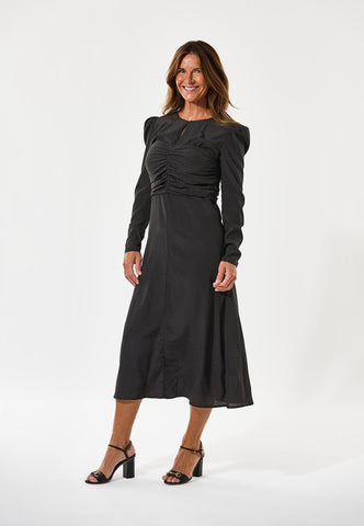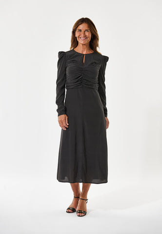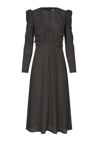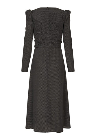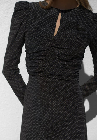 Feine Rüschen formen das Oberteil dieses Kleides aus gepunkteter Seide und sorgen für eine figurbetonte Silhouette. Der leicht ausgestellte Rock reicht bis unter das Knie. Puffärmel mit abnehmbaren Schulterpolstern und Schlüssellochausschnitt vorn setzen stilvolle Akzente. Rückseitiger Reißverschluss.