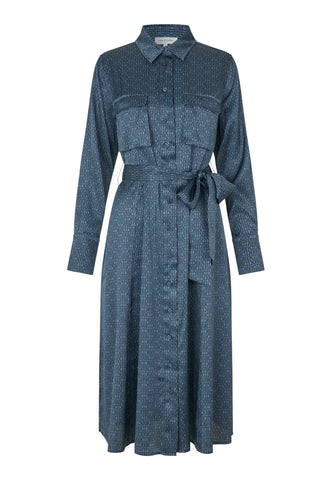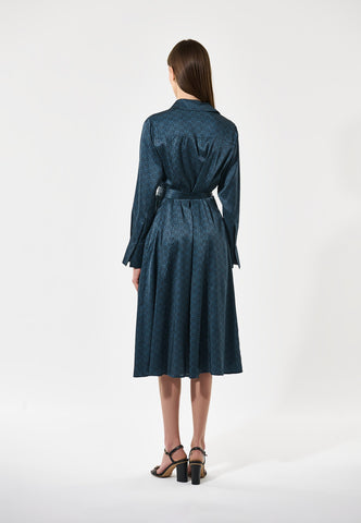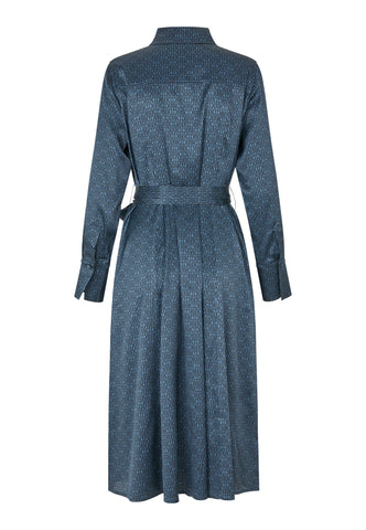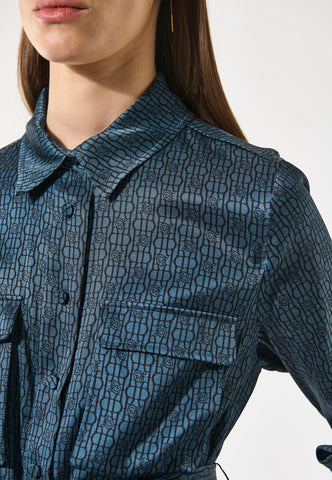 Ein hoher Stehkragen und ein überkreuzter V-Ausschnitt verleihen diesem Seidenkleid mit schwarz-weißem Grafikmuster eine elegante Ausstrahlung. Der normal geschnittene Körper wird durch einen Taillenband vorne oder hinten akzentuiert. Raglanärmel mit passenden Bändern runden das Design ab.