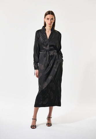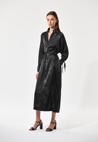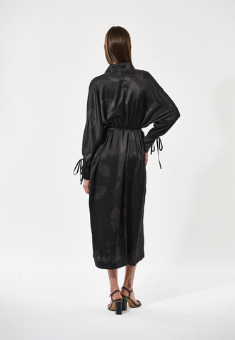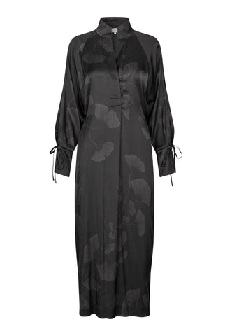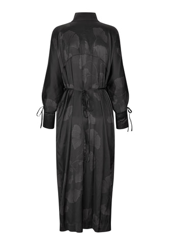 Ein hoher Stehkragen und ein überkreuzter Ausschnitt prägen das Design dieses eleganten Kleids aus schwarzer Seide, das mit dunkelgrauen Ginkgoblättern bedruckt ist. Der normal geschnittene Body reicht bis zur Mitte der Wade und wird durch eine feine Kordel, die wahlweise vorn oder hinten gebunden werden kann, in der Taille akzentuiert. Passende Bindebänder bilden den stilvollen Abschluss der voluminösen Raglanärmel.