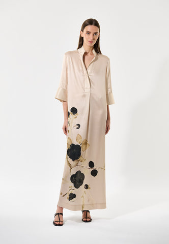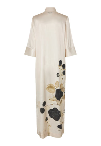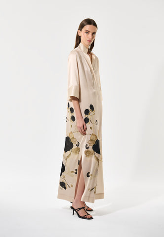 Helga – ein ikonischer Klassiker von Dea Kudibal – ist ein locker geschnittenes Maxikleid aus Seide mit Kimono-Ausschnitt, Stehkragen und ¾-langen, weiten Ärmeln. Diese Version begeistert mit einem spektakulären Lotusblütendruck, der sich scheinbar vom Saum emporrankt.