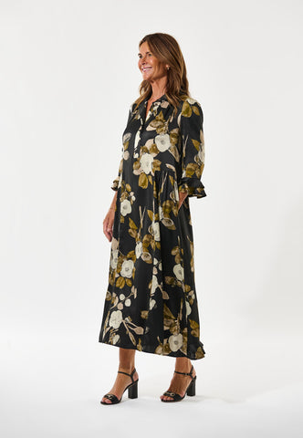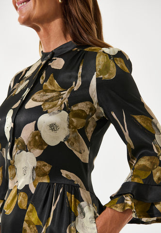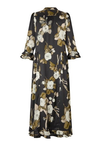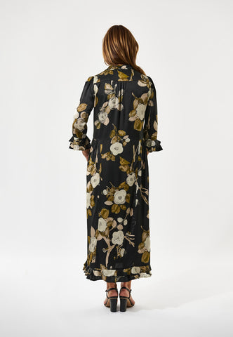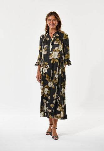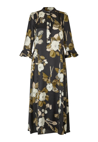 Dieses mittellange Seidenkleid mit zartem Kamelienmuster auf dunklem Grund hat eine lockere Passform mit Rundhalsausschnitt, Knopfleiste vorn und gerüschten Manschetten. Seitentaschen sorgen für zusätzlichen Komfort und entspannte Eleganz.