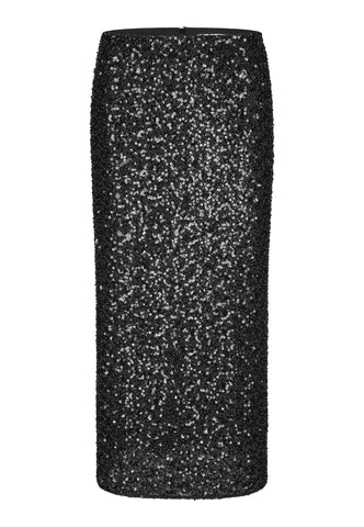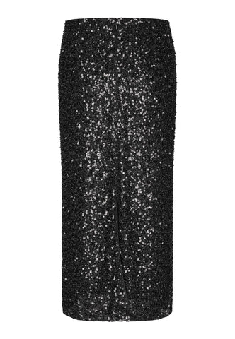 Ein Paradebeispiel für zurückhaltenden Luxus: Dieser figurbetonte Rock ist vollständig mit schwarzen Pailletten besetzt. Mit unsichtbarem Reißverschluss hinten lässt er sich vielseitig stylen – ob mit T-Shirt, Bluse oder dem passenden Anine-Oberteil für einen glamourösen Look.