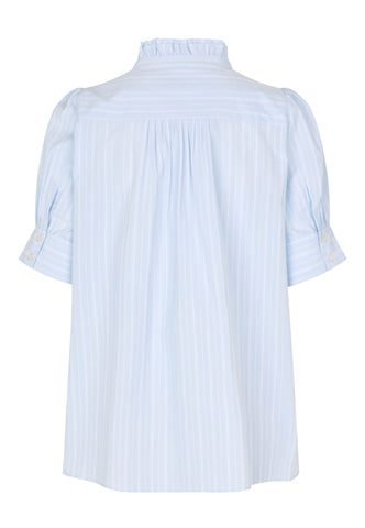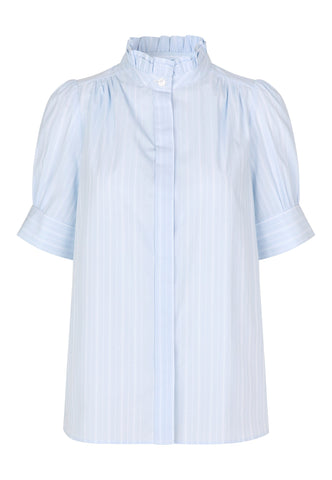 Diese raffinierte, elegante Bluse mit kurzen Ärmeln aus hellblau gestreifter Popeline hat zwei Volants, die einen Stehkragen bilden, sowie verdeckte Knöpfe entlang der Vorderseite. Kleine Falten finden sich vorne und hinten am Halsausschnitt, und die Schulterpolster aus Oberstoff sind abnehmbar.